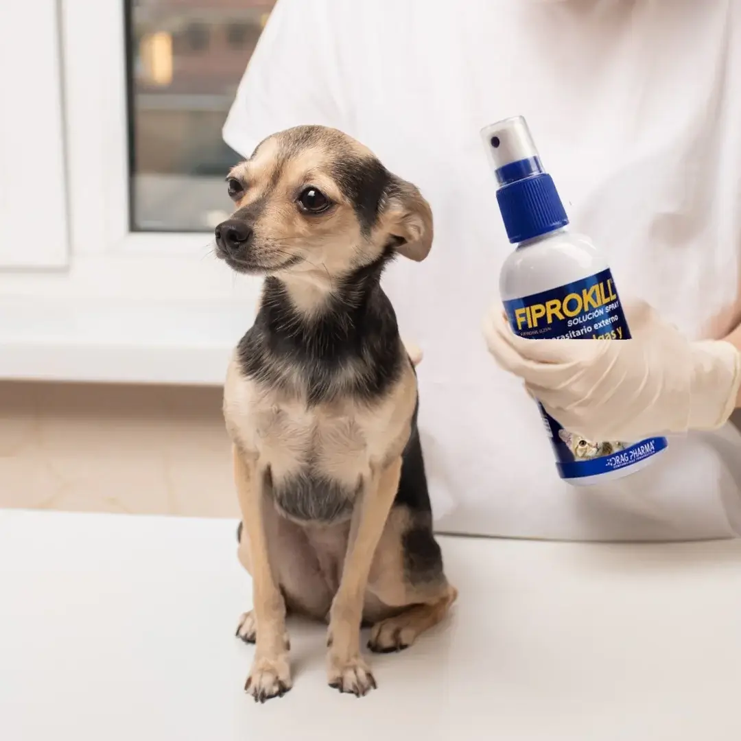 La aplicación de Fiprokill es fácil y segura. Solo necesitas asegurarte de estar en un área bien ventilada y usar guantes. Aplica el spray a contrapelo, a una distancia de aproximadamente 20 cm, cubriendo áreas como el vientre, el pecho, el abdomen y las patas. En animales de pelo largo, separa el pelo para que el producto llegue hasta la raíz.