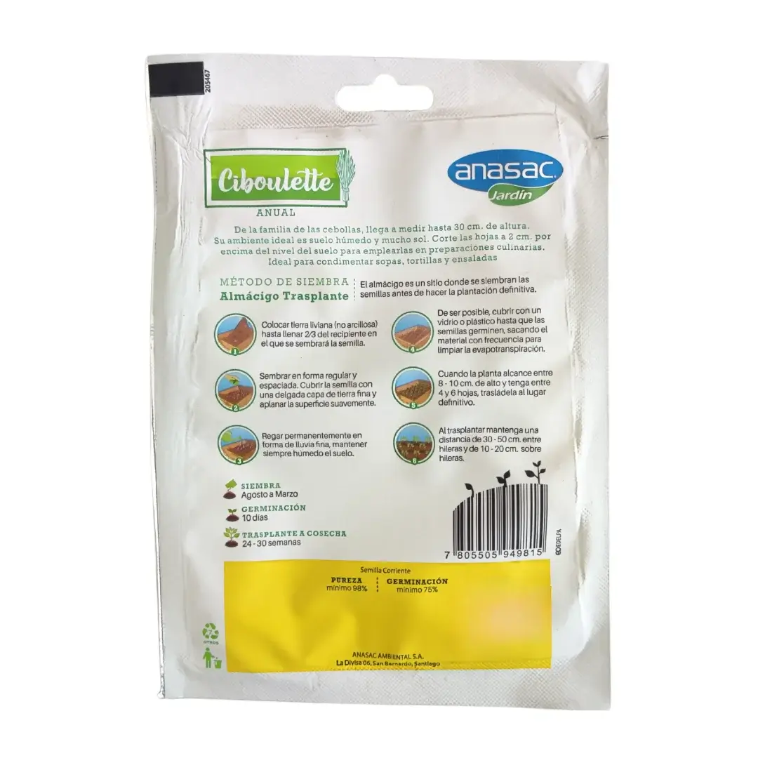 La Semilla de Ciboulette de Anasac le permitirán cultivar esta popular hierba aromática que pertenece a la familia de las cebollas. La planta alcanza hasta 30 cm de altura y es altamente valorada en la cocina por su sabor sutil y delicado. Es perfecta para condimentar sopas, tortillas y ensaladas.