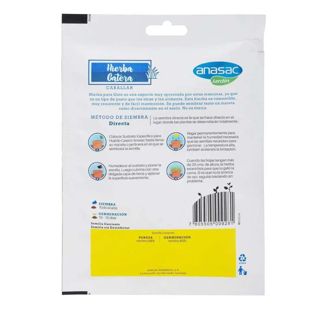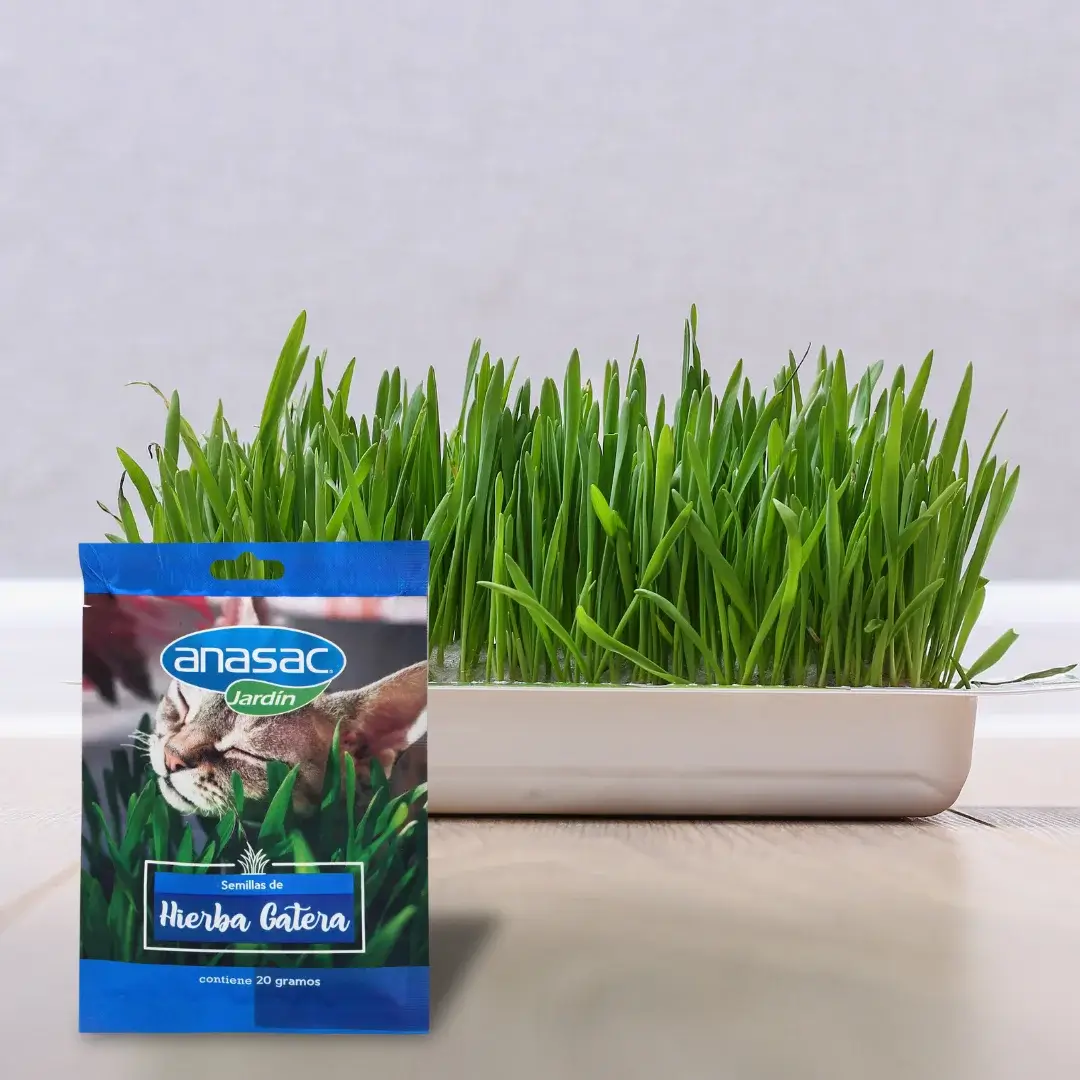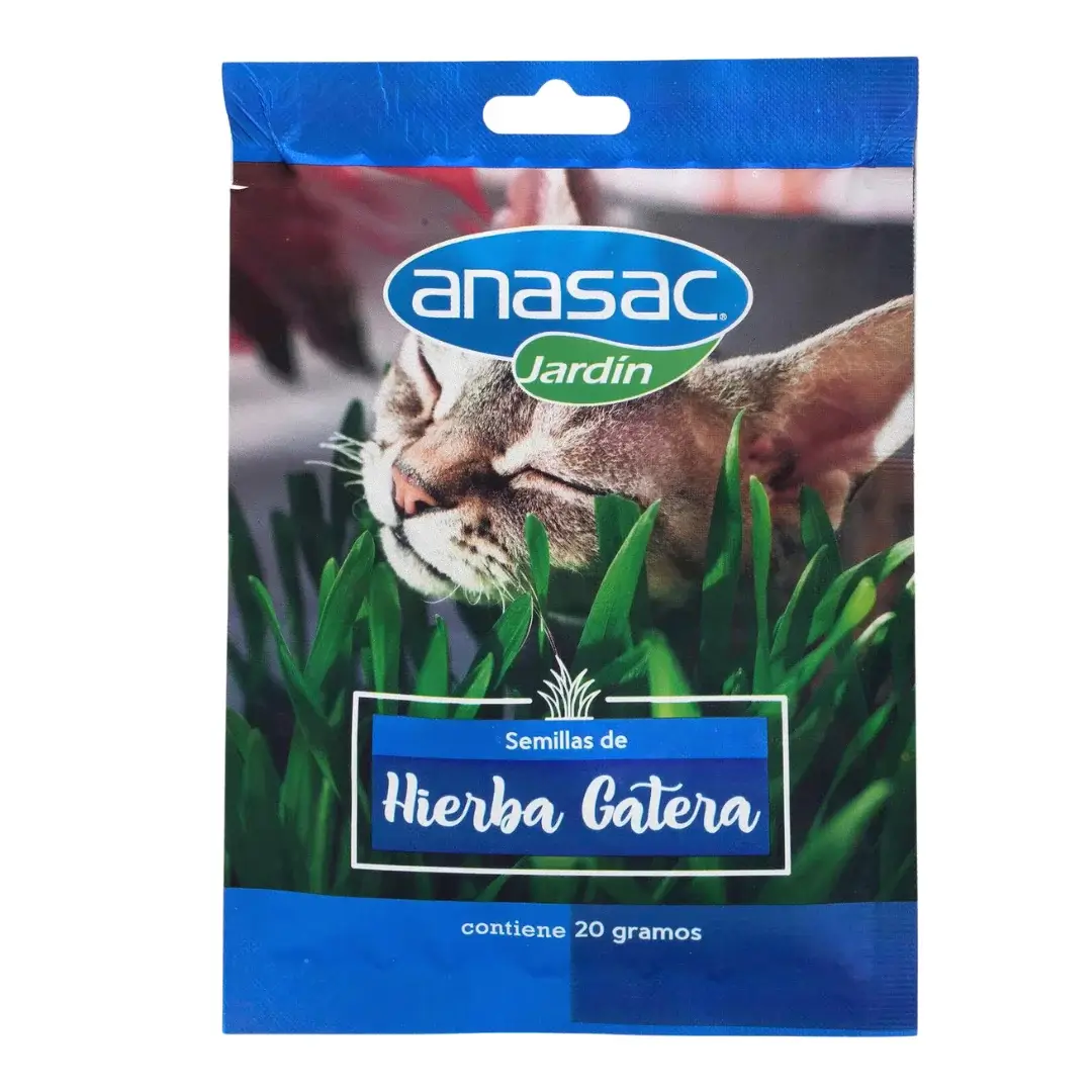 La Hierba para Gato de Anasac es una especie de pasto especialmente cultivada, muy apreciada por los felinos, ya que los atrae y les proporciona un suplemento alimenticio natural. Esta hierba es completamente comestible, no tóxica y resulta muy resistente y de fácil mantención.
